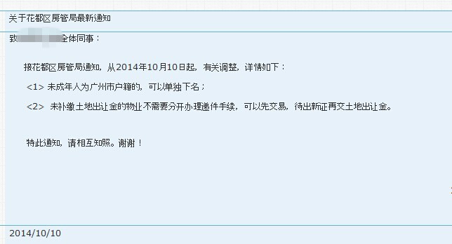 据新浪乐居了解,该通知出自某大型中介公司。通知称,广州市户口的未成年人员可以单独落名字,此外,未补缴土地出让金的物业不需要分开办理递件手续,可以先交易,待出新的房产证再交土地出让金。该中介公司一内部人士称,消息来源于其旗下的按揭公司,可信度比较高。不过,编辑向另一大型中介公司满堂红求证,对方则称没有接到该通知。后来,该消息得到广东中原地产代理有限公司的证实,中原地产项目部总经理黄韬对新浪乐居透露,该通知确实出自花都房管局,张贴于该局门口的玻璃门,而且得到房管局内部证实。