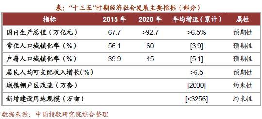 五年宏观目标确定,经济保持中高速增长,产业迈向中高端水平。《国民经济和社会发展第十三个五年规划纲要》全文正式发布,要求到2020年国内生产总值和城乡居民人均收入比2010年翻一番,未来五年GDP和居民人均可支配收入均要增速要保持在6.5%以上。同时提出,户籍人口城镇化率加快提高,到2020年我国常住人口城镇化率将达到60%,户籍人口城镇化率也要达到45%,未来将有超过5000万人口向城镇迁移,超过7000万农村人口向市民转化。