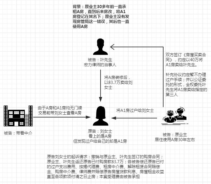 在宏力主办律师吴凯的据理力争之下,作为被告之一的叶先生在此案中虽是原告支出的83.7万房款的收款人,最后却能全身而退不用赔偿原告一分一毫,而是由原业主赔了83.7万给原告。