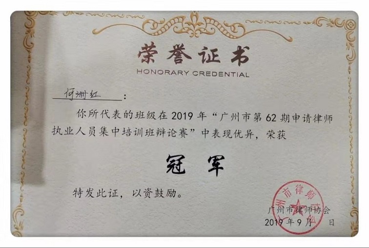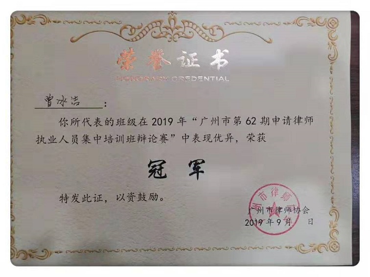 广东宏力律师事务所的两位实习律师曾冰洁、何珊红在广州市律师协会举办的2019年“广州市第62期申请律师执业人员集中培训班辩论赛”中表现优异,荣获冠军,为我所赢得荣誉。