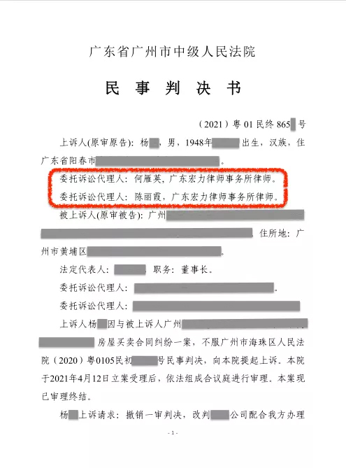 收到一审判决书后,杨先生表示法院能够认可买卖关系的成立已经是意外之喜,我们也非常开心至少能保障杨先生在此居住的权利。但未能取得房屋所有权对当事人来说始终是遗憾,本着坚持不懈为当事人维权穷尽所有努力的宗旨,杨先生决定继续委托何律师向广州市中级人民法院提起上诉,要求开发商配合杨先生办理房屋的产权证。