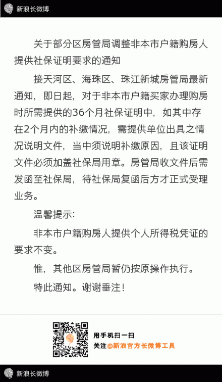 1月15日,中原地产旗下广州汇瀚顾问有限公司在微博上发布消息称,接天河区、海珠区、珠江新城房管局最新通知,即日起,对于非本市户籍买家办理购房时所需提供的 36个月社保证明中,如其中存在2个月内的补缴情况,需提供单位出具之情况说明文件,当中须说明补缴原因,且该证明文件必须加盖社保局用章。房管局收文件 后需发函至社保局,待社保局复函后方才正式受理业务。